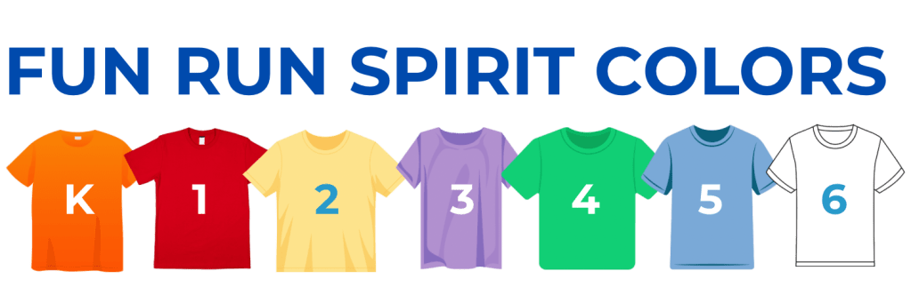 Students dress in their grade’s spirit color: Kindergarten- Orange, 1st- Red, 2nd- Yellow, 3rd- Purple, 4th- Green, 5th- Blue, 6th- White